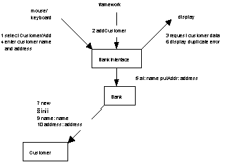 | 5 at: name putAddr: address | The bank interface asks the bank to insert the customer's name and address into its database of customers. |